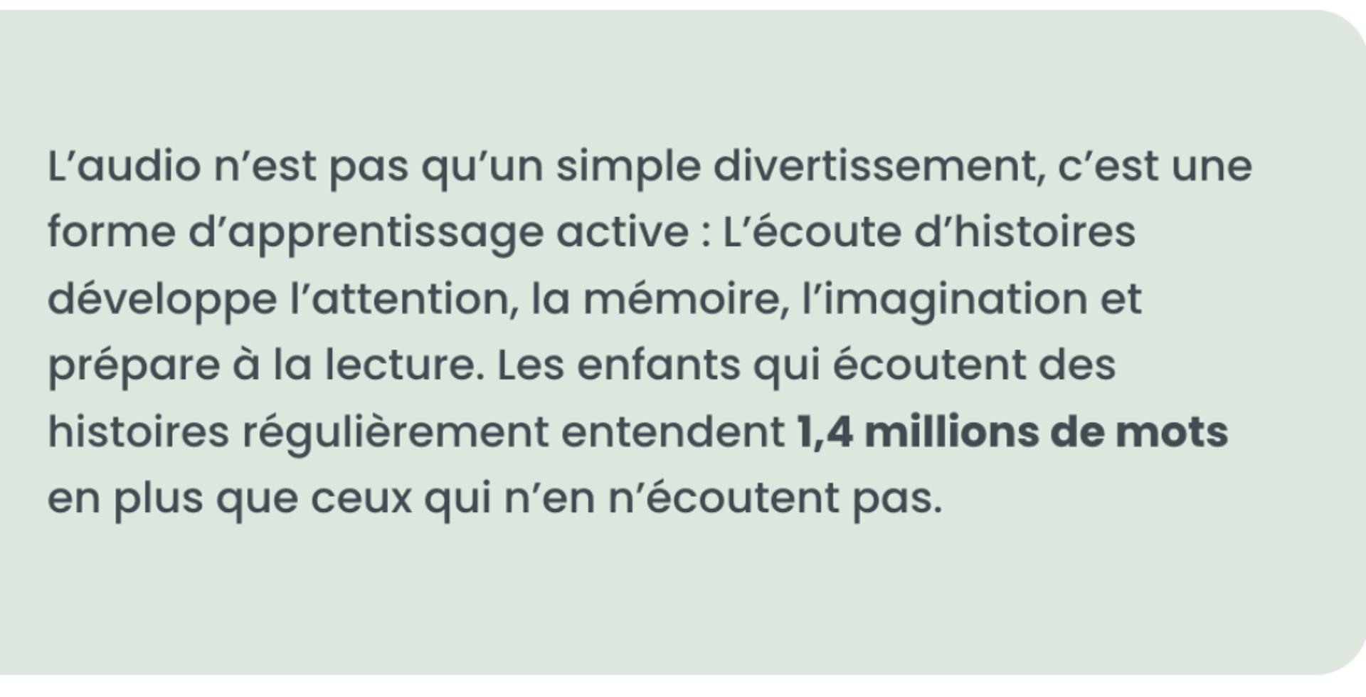 L’audio n’est pas qu’un simple divertissement, c’est une forme d’apprentissage active : L’écoute d’histoires développe l’attention, la mémoire, l’imagination et prépare à la lecture. Les enfants qui écoutent des histoires régulièrement entendent 1,4 millions de mots en plus que ceux qui n’en n’écoutent pas.